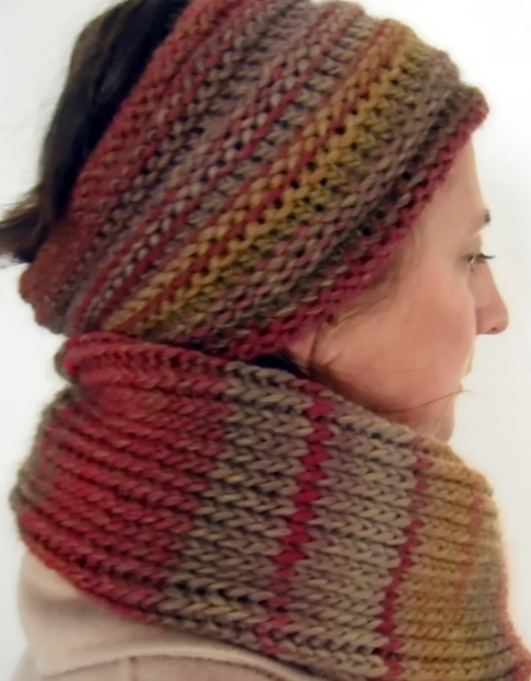 Strickanleitung für ein elastisches Ringel-Stirnband aus Wolle in mehrfach-abwechselnden Runden von Krausrechts- und Krauslinksrippen