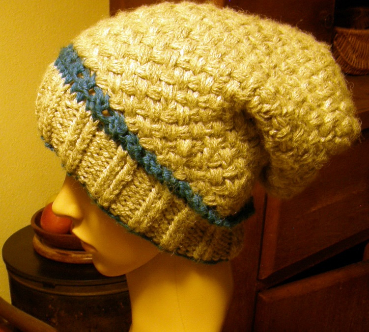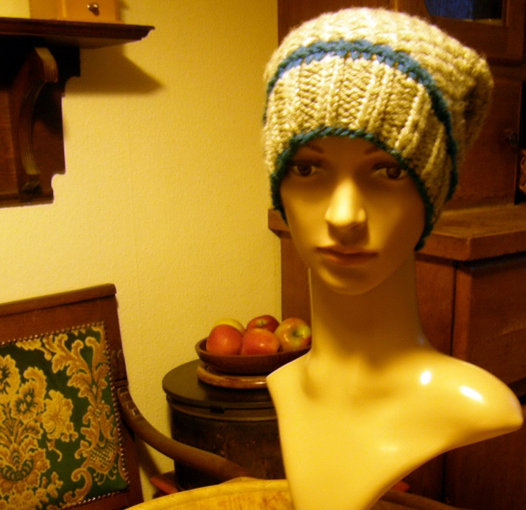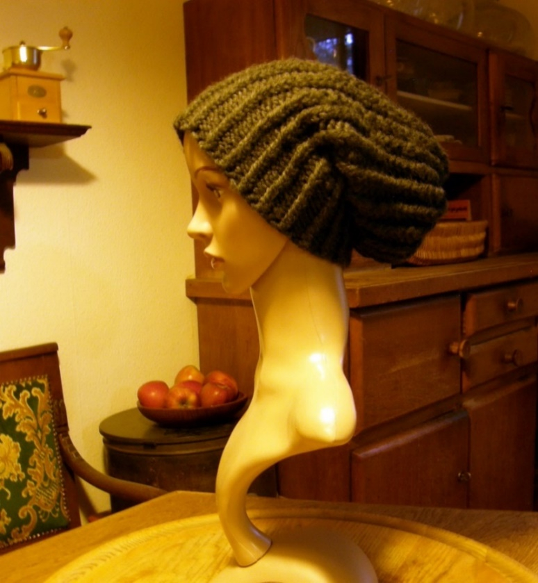 Das Bündchen am unteren Ende der Mütze, das eng und geschmeidig am Kopf liegen soll, wurde im zweifachen Rippenmuster bzw. in Zweier-Rippen 10 cm hoch gestrickt, damit das Bündchen lang genug ist, um es entweder flach gegen den Kopf oder nach oben geklappt tragen zu können.