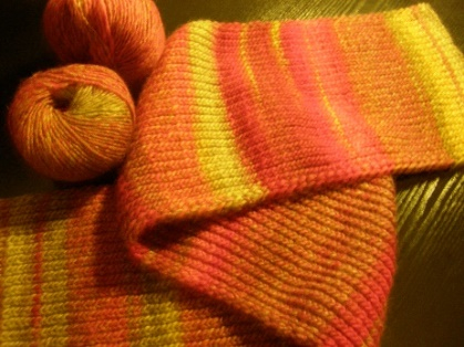 Der Hauptteil des Schals wurde im einfachen Rippenmuster mit einem festen, ebenmässigen Patent-Rand gestrickt. Dieses Muster, auch Einer-Rippen genannt, besteht aus einer Masche rechts und einer Masche links, die wiederholend bis zum Ende der Reihe gestrickt wird. Auf der Rückreihe sind die Maschen umgekehrt, das heisst die rechte Masche erscheint als eine linke Masche und die linke Masche erscheint als eine rechte Masche und wird dementsprechend – also wie die Masche erscheint – gestrickt.
