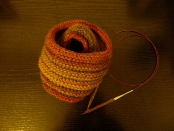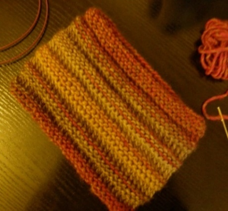 Um die richtige Maschenzahl für einen bestimmten Kopfumfang festzustellen, habe ich anhand einer Maschenprobe, die ich aus der vorgenannten Rigato-Mischwolle mit einer 7 mm starken Rundstricknadel angefertigt habe, 64 Maschen für einen Kopfumfang von 52 cm ausgerechnet und sie als Maschenanschlagszahl für die Mütze verwendet. Es ist empfehlenswert, ein solches Probestück zu stricken, um festzustellen, wieviele Maschen erforderlich sind, damit die Mütze bzw. das Bündchen eng und geschmeidig am Kopf liegt. Um zu erfahren, wie eine Maschenprobe für Mützen und Stirnbänder funktioniert, siehe ‹Maschenprobe und deren Berechnung nach dem Schnellprüfverfahren von Ana Kraft› und das dazu empfohlene Video.