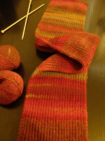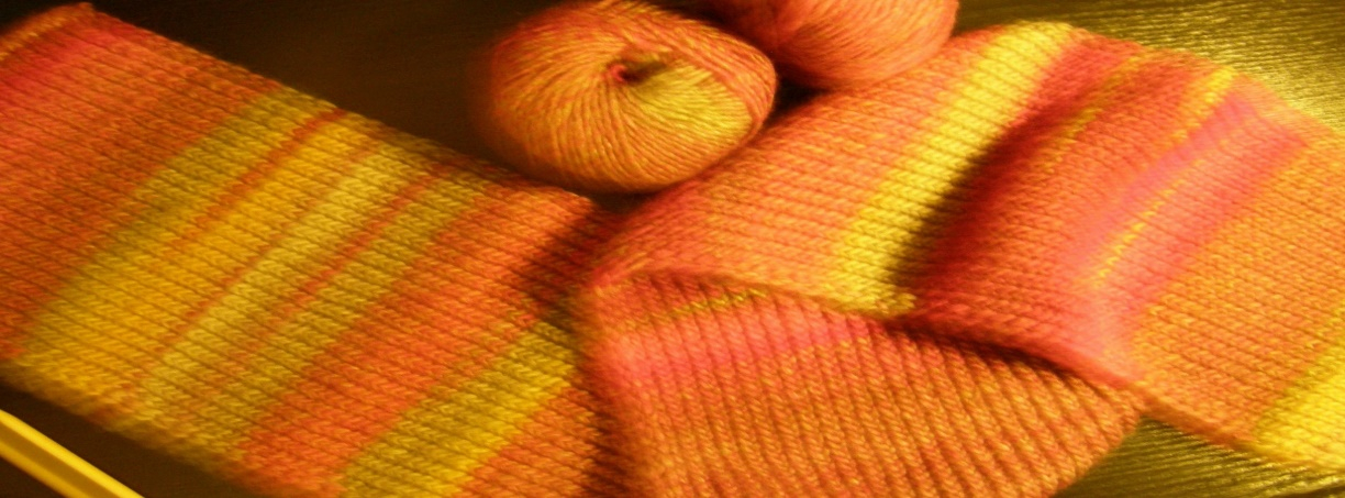 Der Hauptteil des Schals wurde im einfachen Rippenmuster mit einem festen, ebenmässigen Patent-Rand gestrickt. Dieses Muster, auch Einer-Rippen genannt, besteht aus einer Masche rechts und einer Masche links, die wiederholend bis zum Ende der Reihe gestrickt wird. Auf der Rückreihe sind die Maschen umgekehrt, das heisst die rechte Masche erscheint als eine linke Masche und die linke Masche erscheint als eine rechte Masche und wird dementsprechend – also wie die Masche erscheint – gestrickt.